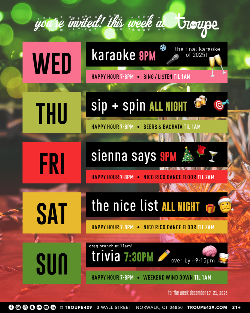 Troupe429, housed in a historic landmark building, is a premier arts venue that fosters community engagement and bringing strangers & friends together - through unforgettable live shows by local talent and international stars, acclaimed dance parties, and trailblazing creative programming. Some favorite iconic guests at Troupe429 include celebrity fashion designer Christian Siriano, Academy Award nominee Danielle Brooks, 3-time TONY nominee Robin de Jesús, BRIT award-winner Kate Nash, Real Housewife of New York Sonja Morgan, Miss Connecticut USA Shavana Clarke, and RuPaul’s Drag Race judge Ross Mathews!
